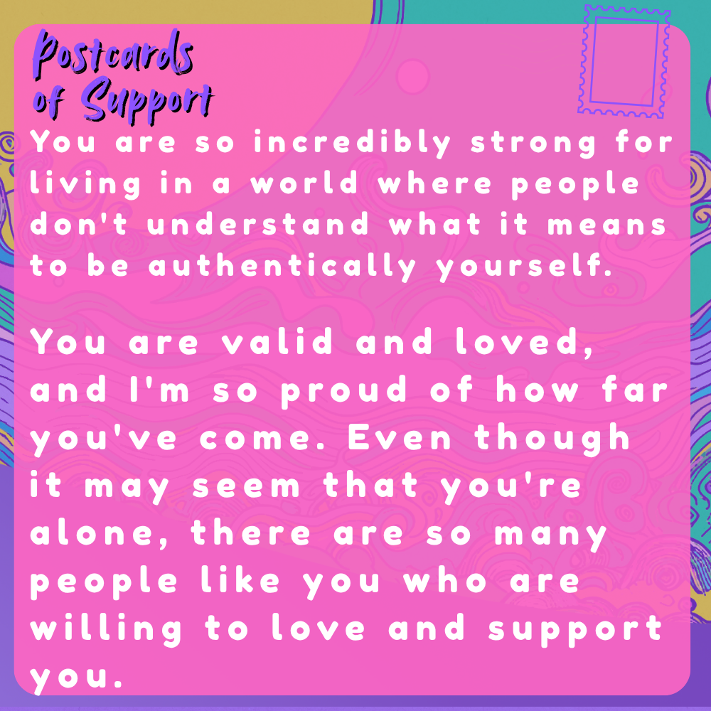 It can be very isolating if you don’t have anyone offering you words of support on your journey to be your authentic self. What encouraging words would you want to spread if you had the chance? What would have been meaning for you to have heard?